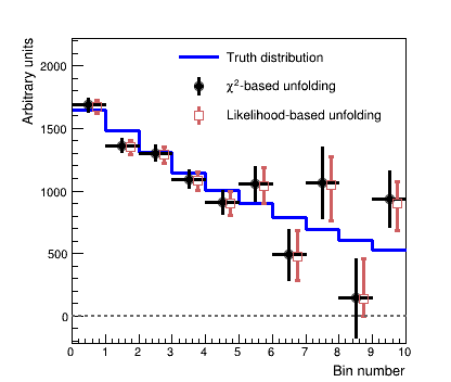 The figure below shows a comparison of likelihood-based unfolding and a least-squares based unfolding as implemented in RooUnfold.