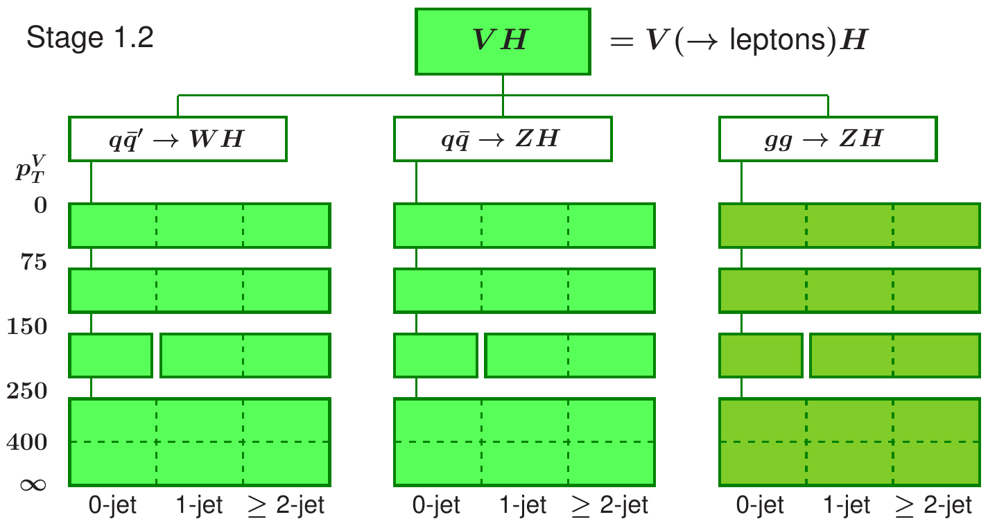 In this tutorial we will focus on the ZH production, with the Z boson decaying to charged leptons, and Higgs boson reconstructed with the resolved \(b\bar{b}\) pair. We will also use only a part of the Run 2 categories, we will not achieve the same sensitivity as the full analysis. Note that ggZH and ZH production modes are combined in the fit, since it is not possible to resolve them at this stage of the analysis. The STXS categories are defined independently of the Higgs decay channel, to streamline the combinations of the cross section measurement.