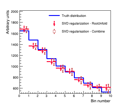 The figure below shows an example unfolding using the "SVD regularization" approach with the least squares method (as implemented by RooUnfold) and implemented as a penalty term added to the likelihood using the maximum likelihood approach in Combine.