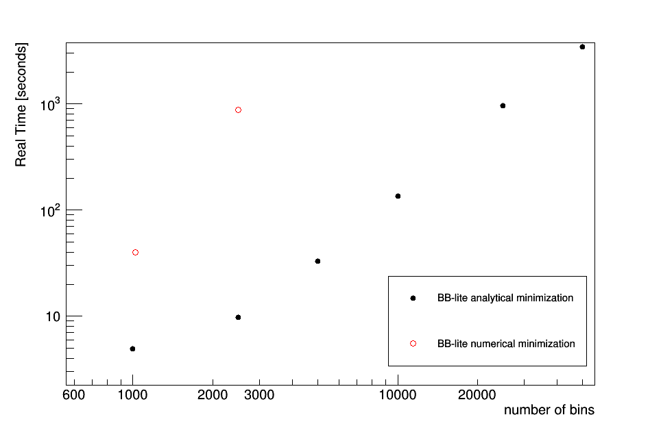 The figure below shows a performance comparison of the analytical minimisation versus the number of bins in the likelihood function. The real time (in seconds) for a typical minimisation of a binned likelihood is shown as a function of the number of bins when invoking the analytic minimisation of the nuisance parameters versus the default numerical approach.
