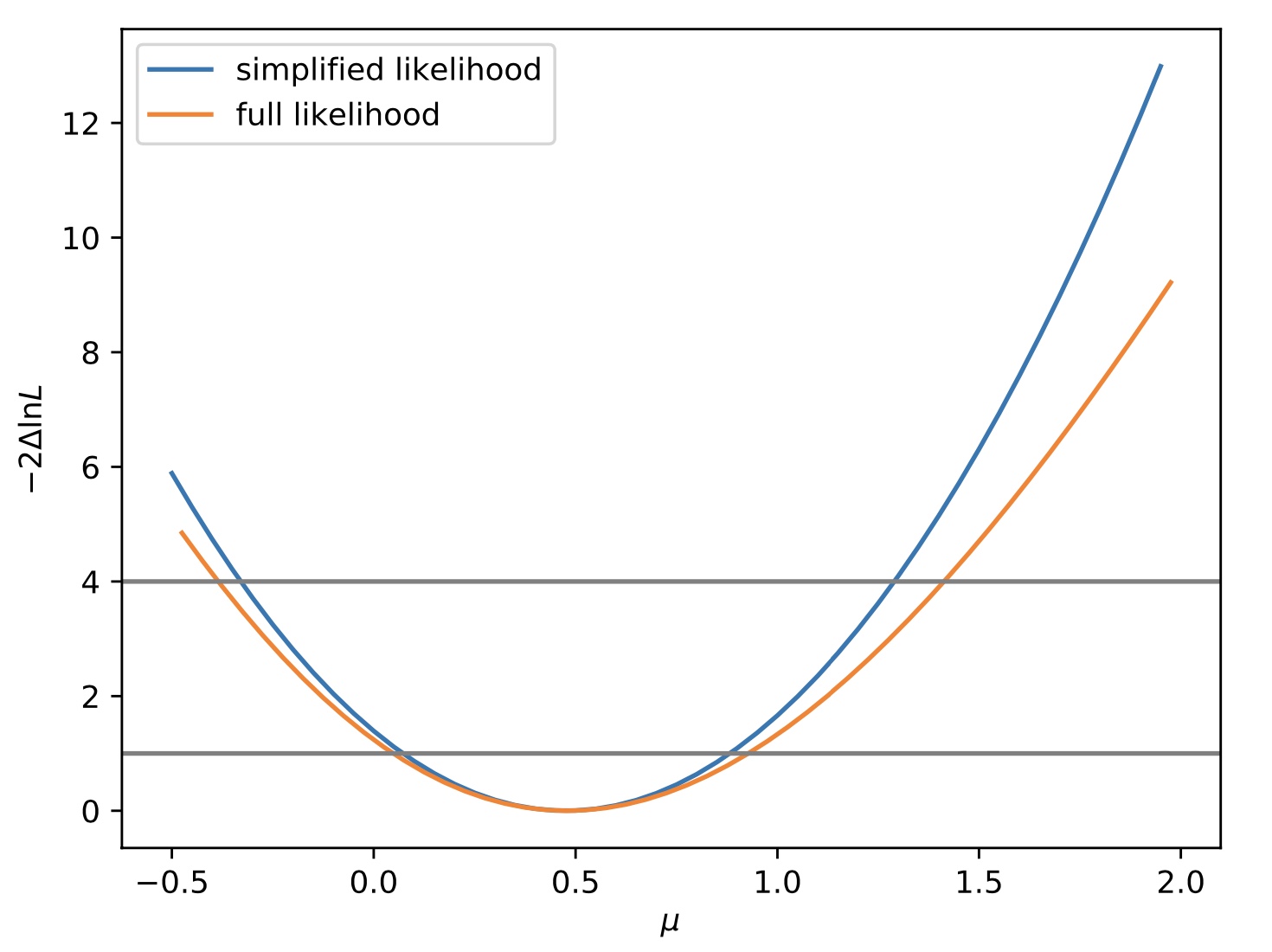 We can compare the profiled likelihood scans from our simplified likelihood (using the python file we just created) and from the full likelihood (that we created with Combine.). For the former, we need to first checkout the SLtools package