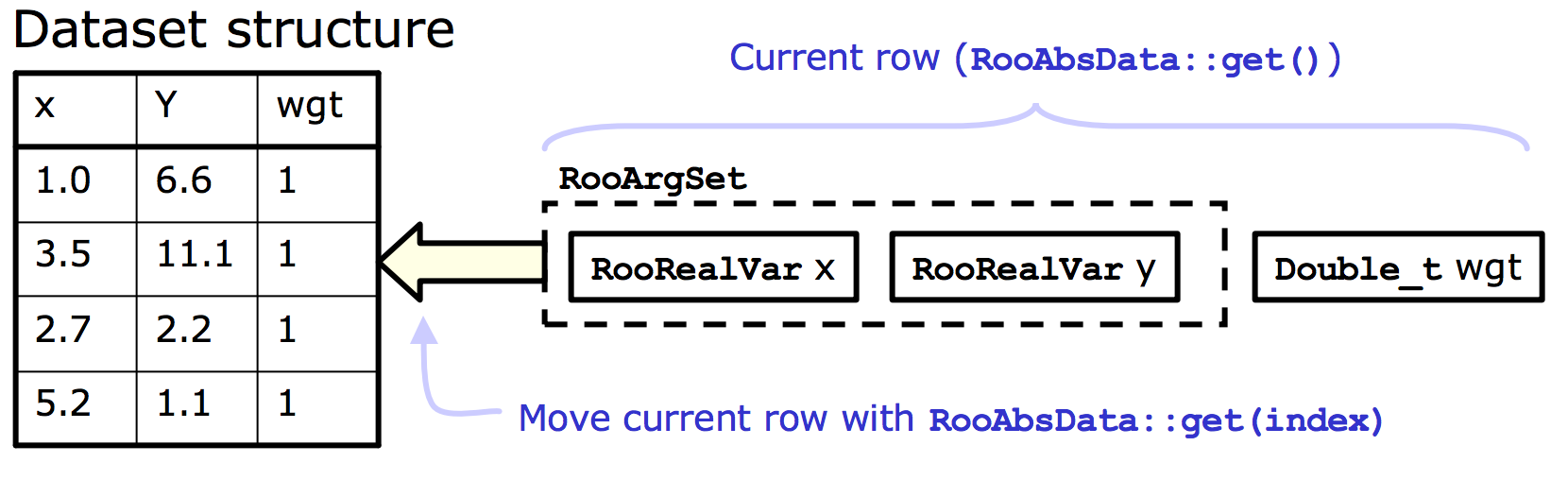 In RooFit, any variable, data point, function, PDF (etc.) is represented by a c++ object, which is also available via automatic Python bindings.