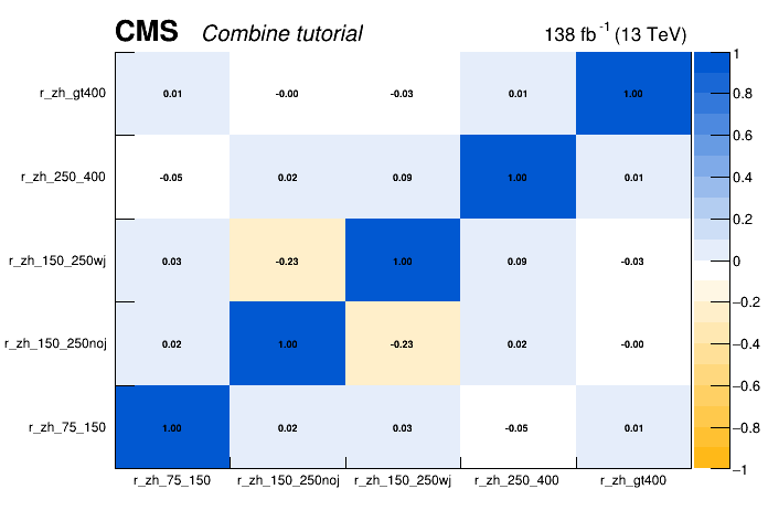 Then the RooFitResult, containing correlations matrix, can be found in the fitDiagnostics.full_model.root file under the name fit_s. The script plotCorrelations_pois.py from the exercise git-lab repository can help to plot the correlation matrix.