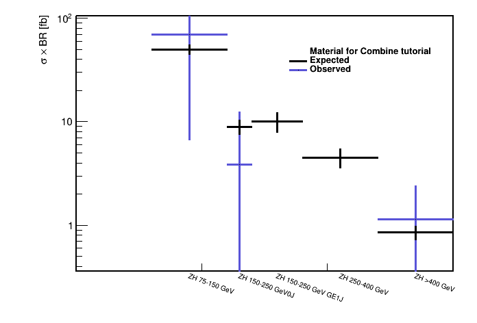 Repeat the same command for other POIs to fill the summary_zh_stxs.json, which can then be used to make the cross section plot by multiplying the standard model cross sections by the signal strengths' best-fit values as shown below.
